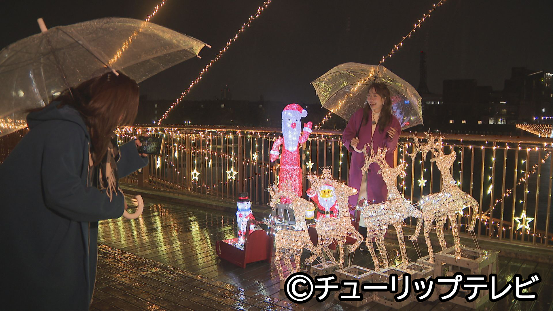 12月25日まで限定で天門橋の上にはクリスマスキャラクターのイルミネーションが出現