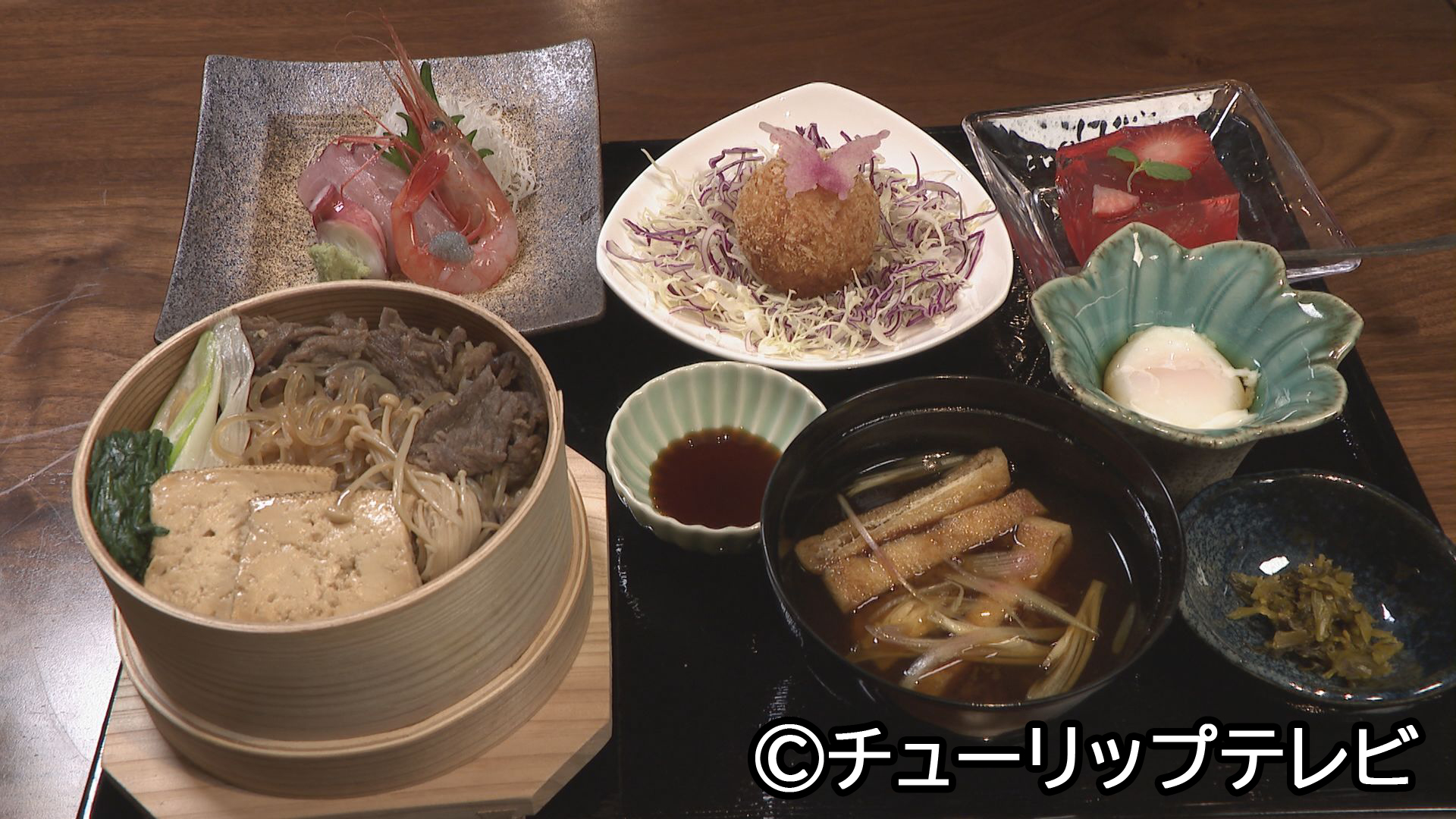 すき焼きわっぱ・ミニ刺身・明太子コロッケ・フルーツ寒天など