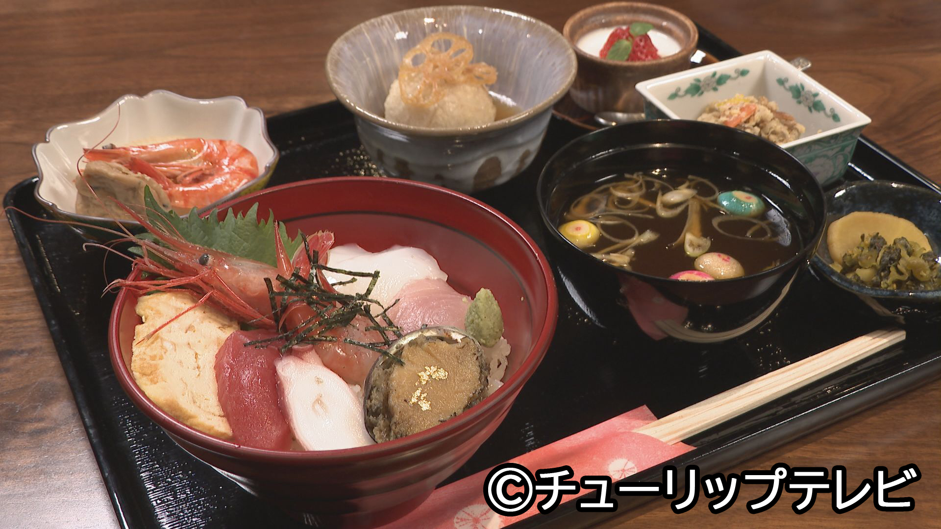 海鮮丼(煮あわび入り)・れんこんまんじゅう・うの花・杏仁プリンなど