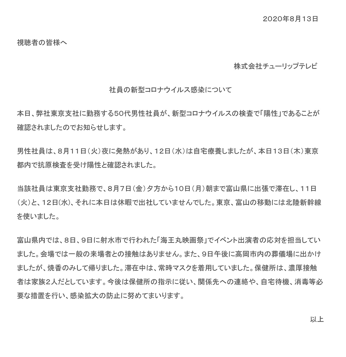 社員の新型コロナウイルス感染について