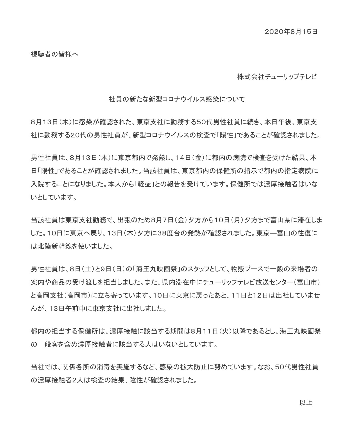 社員の新たな新型コロナウイルス感染について