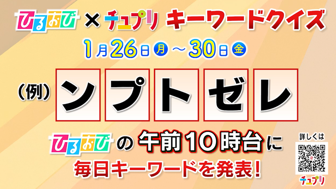 「ひるおび!」(午前10:25〜11:19)の放送中に流れるCMで、毎日「1文字」のキーワードを発表します。