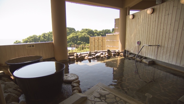 能登半島国定公園の高台に建ち、美しい富山湾に立山連峰が浮かんで見える景勝地に立地しています。敷地内から自噴する温泉は美肌の湯として好評を得ていて、海を望む露天風呂には、 つぼ湯、こしかけ湯、展望サウナもあります。